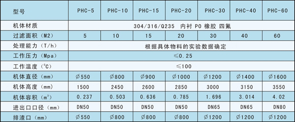 ·适用范围 精细化工、制药食品、结晶体、无机盐粉体、超细金属粉体过滤搅拌机洗涤、活性炭脱色脱炭过滤,压干的微滤机。PHC技术参数表