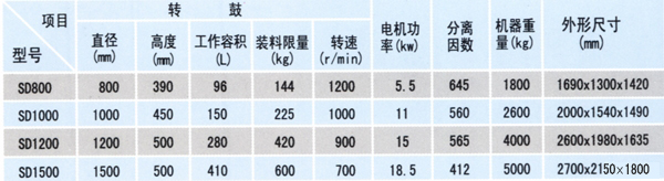 特点和用途SD系列为三足式吊袋上卸料间隙操作的离心机,该系列离心机结构简单,性能可靠,操作维修方便、过滤时间可随意掌握,滤渣能充分洗涤,固相颗粒不被破坏,卸料快而省力,滤袋清洗方便,用途极其广泛,常用于化工、食品、轻工、造纸、采矿、环保等部门,是SS系列离心机较好的替代产品。主要技术参数