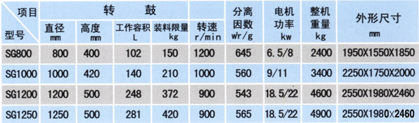 特点和用途 SG系列为三足式刮刀下卸料离心机,它是一种间歇操作的过滤式离心机,该机的进料、分离、洗涤、制动、卸料等工序可通过人工配合电器控制来完成。该机运转平稳,振动小,操作方便,安全可靠,分离洗涤效果好,对物料适应性强,适用于分离含固相颗粒>0.05mm的悬浮液。由于采用窄刮刀,低速封闭式卸料,卸饼性能好,产品品粒不易破碎,对流动性好的物粒适宜。SG主要技术参数