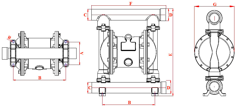 本公司生产的隔膜泵按进出口尺寸分别有3/8"(10mm)、1/2"(1.5mm)、3/4"(20mm)、1"(25mm)、1-1/4"(32mm) 1-1/2"(40mm)、2"(50mm)、2-1/2"(65mm)、3"(80mm)、4"(100mm)规格,流体部件材质有:铝合金、铸钢、聚丙烯、不锈钢、衬胶、衬氟等;隔膜根据不同膜片材质分别有:丁晴橡胶、氯丁橡胶、氟橡胶、氟塑料、F46四氟,以及高性能金钢膜片,以满足不同液体介质的需要。